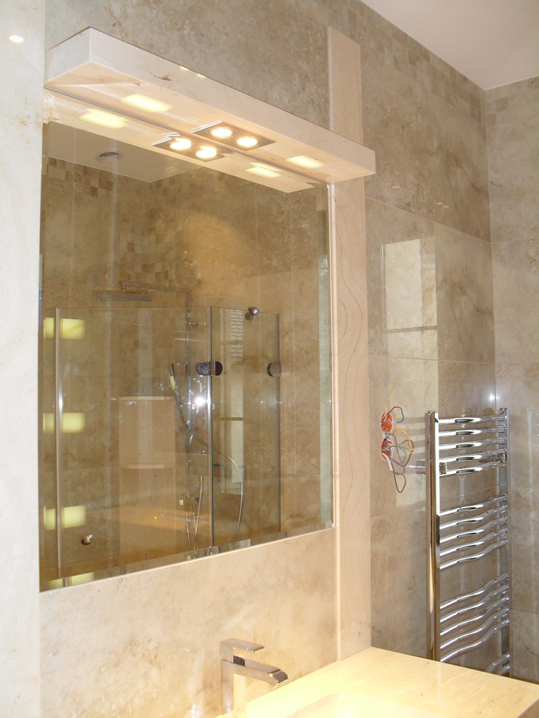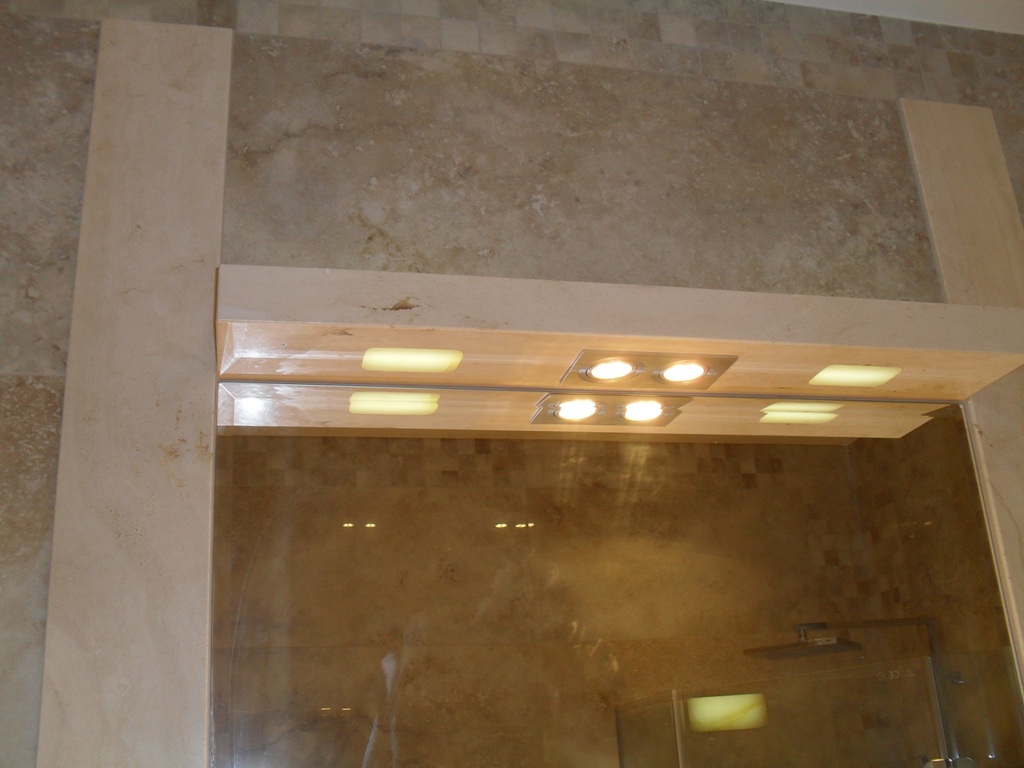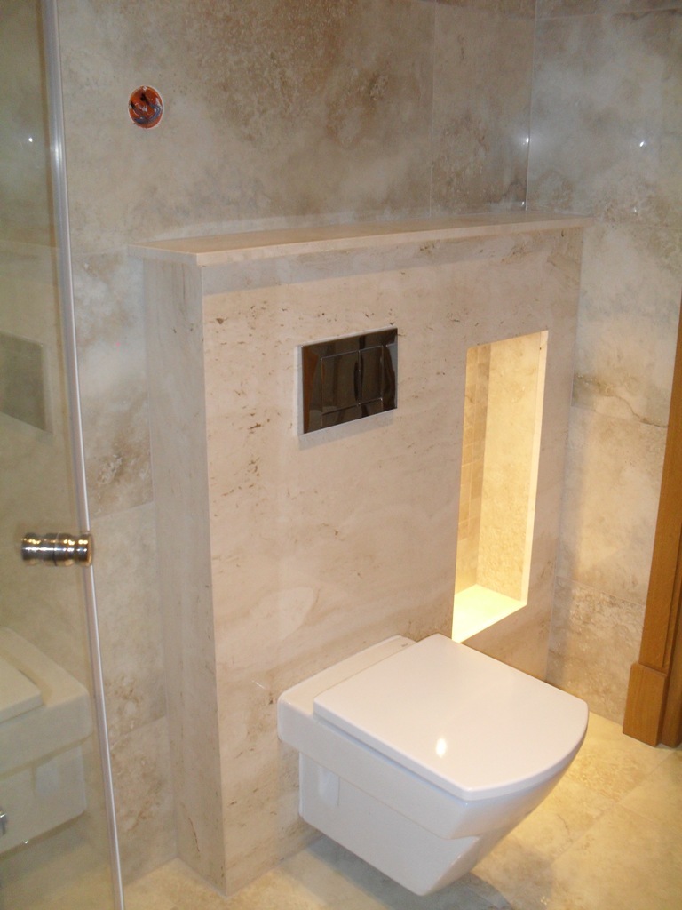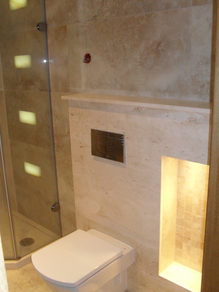 Łazienka jest przykładem połączenia płytki i kamienia. Toaleta umieszczona jest na ściance marmurowej, z wnęką podświetlaną. Prysznic oraz lutro posiadają podświetlane motywy. Brodzik oraz umywalka wykonane są z marmuru (trawertyn), z tym że umywalka jest podwieszana. Sufit także jest podwieszany i podświetlany listwą ledową sterowaną pilotem.