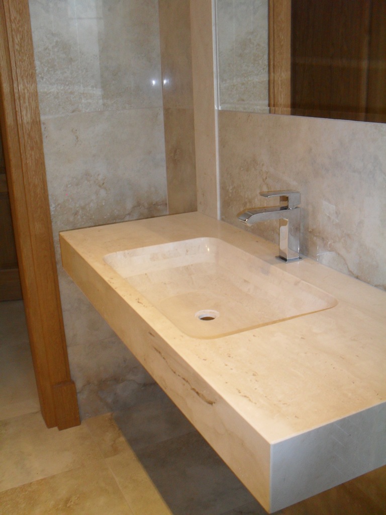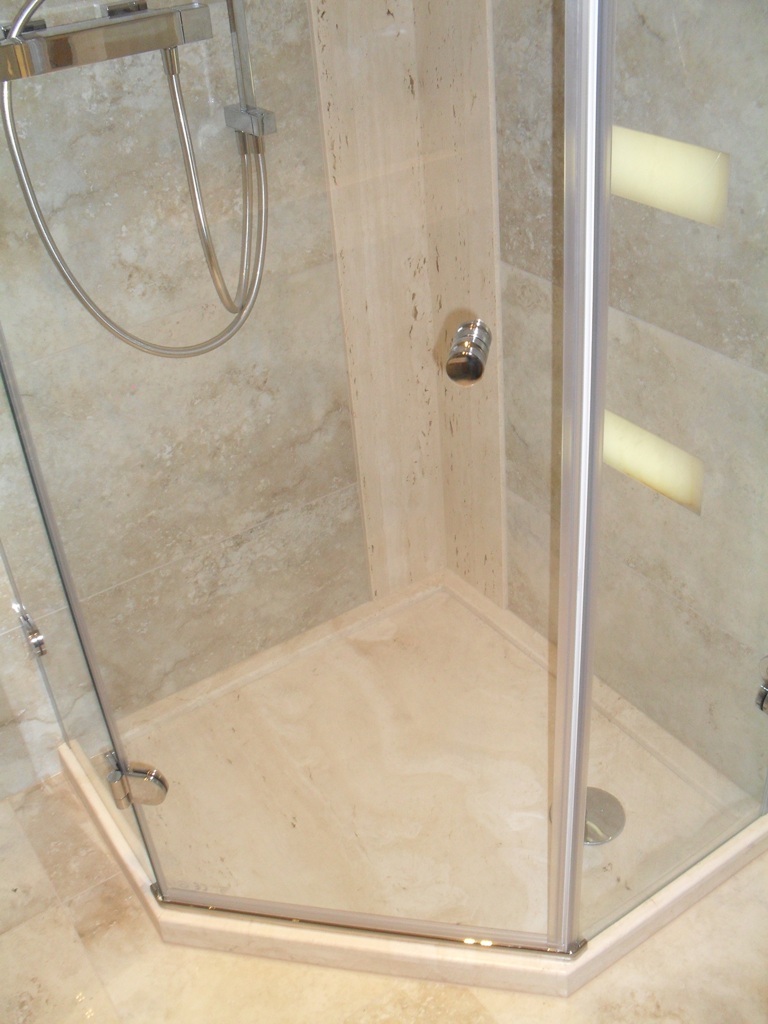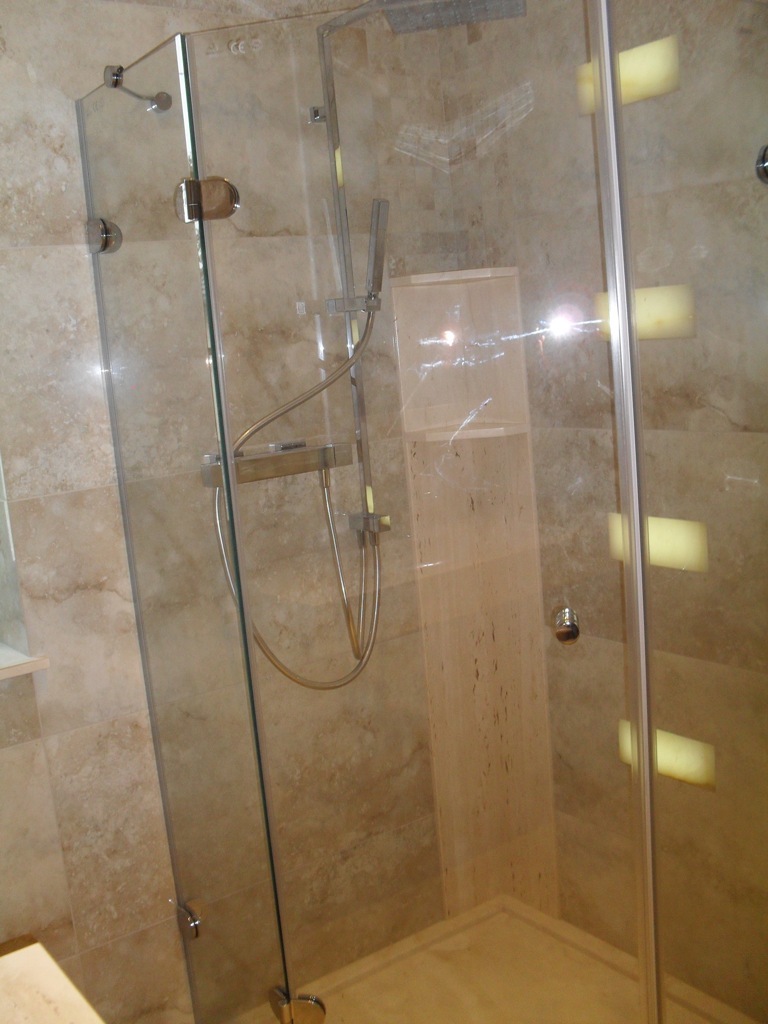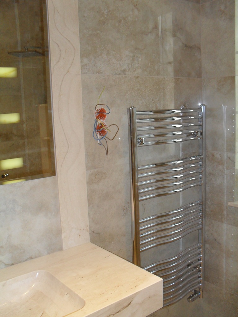 Łazienka jest przykładem połączenia płytki i kamienia. Toaleta umieszczona jest na ściance marmurowej, z wnęką podświetlaną. Prysznic oraz lutro posiadają podświetlane motywy. Brodzik oraz umywalka wykonane są z marmuru (trawertyn), z tym że umywalka jest podwieszana. Sufit także jest podwieszany i podświetlany listwą ledową sterowaną pilotem.