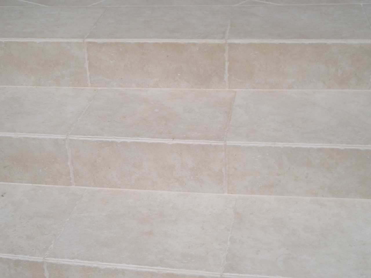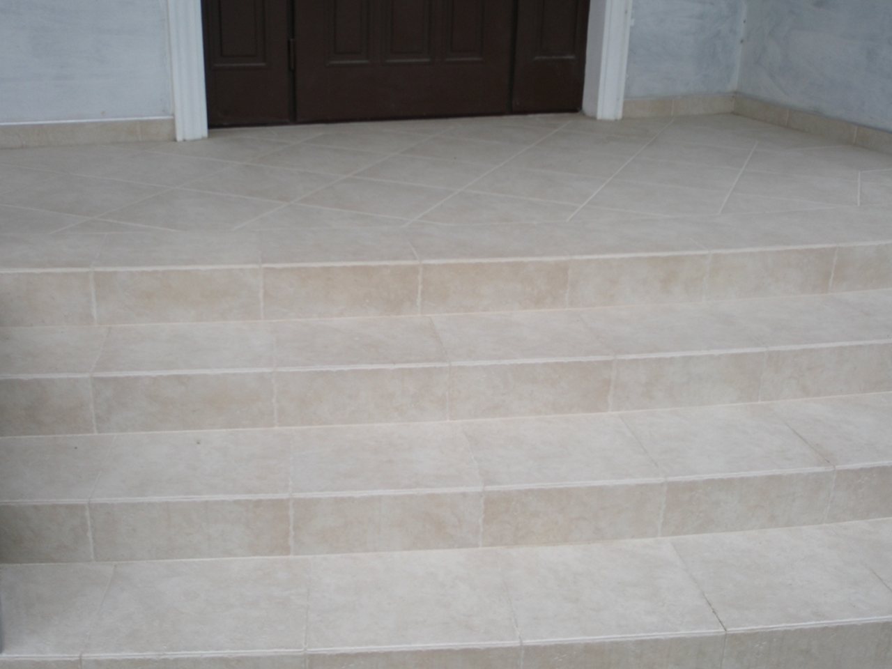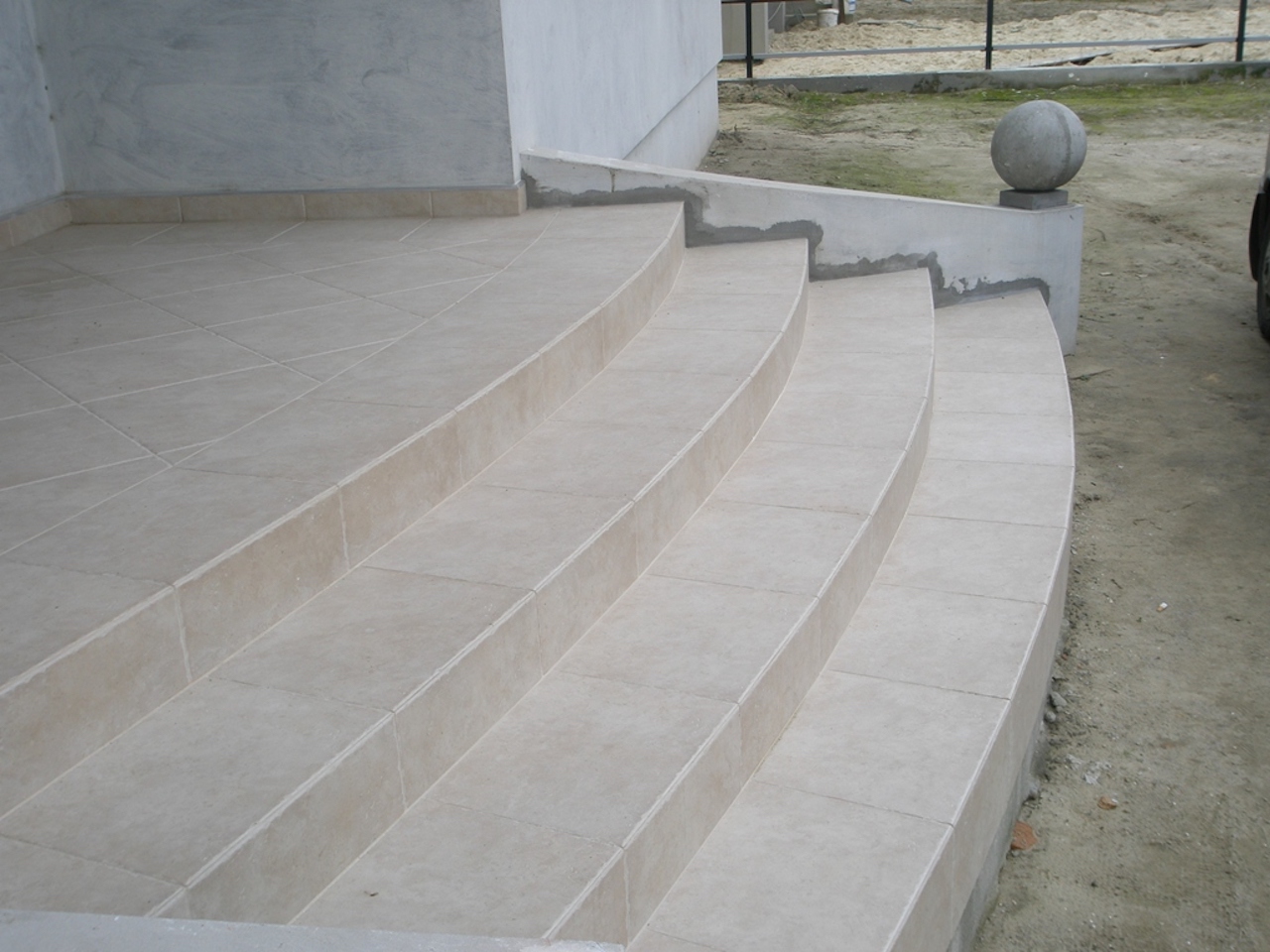 Schody wejściowe, tworzące delikatny łuk, szlifowane na rantach trepów, wyłożone płytką gresową.
