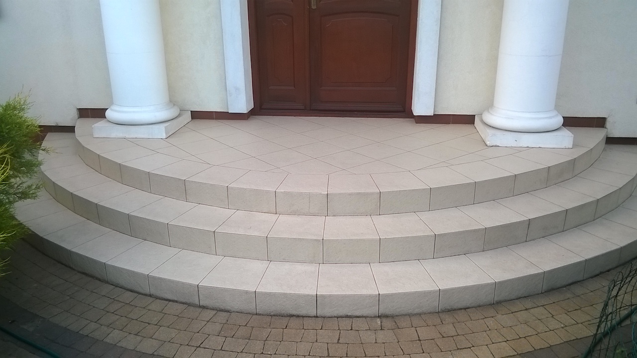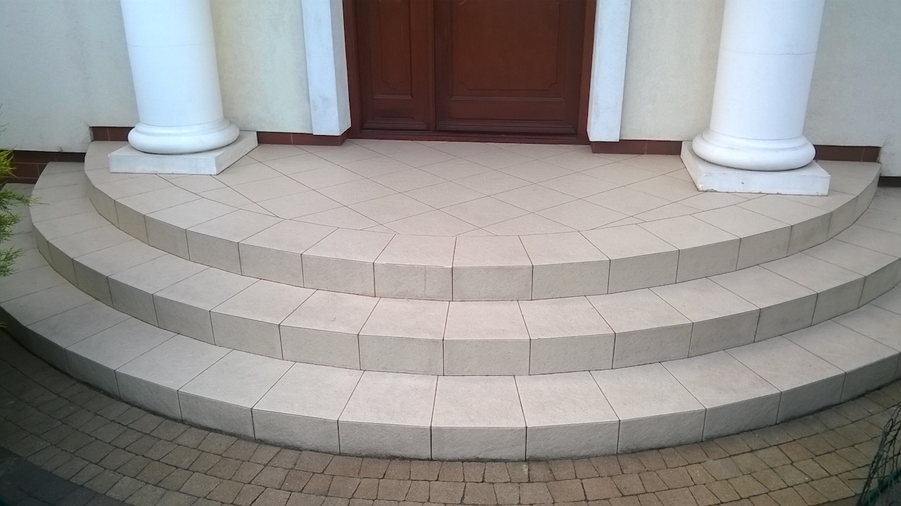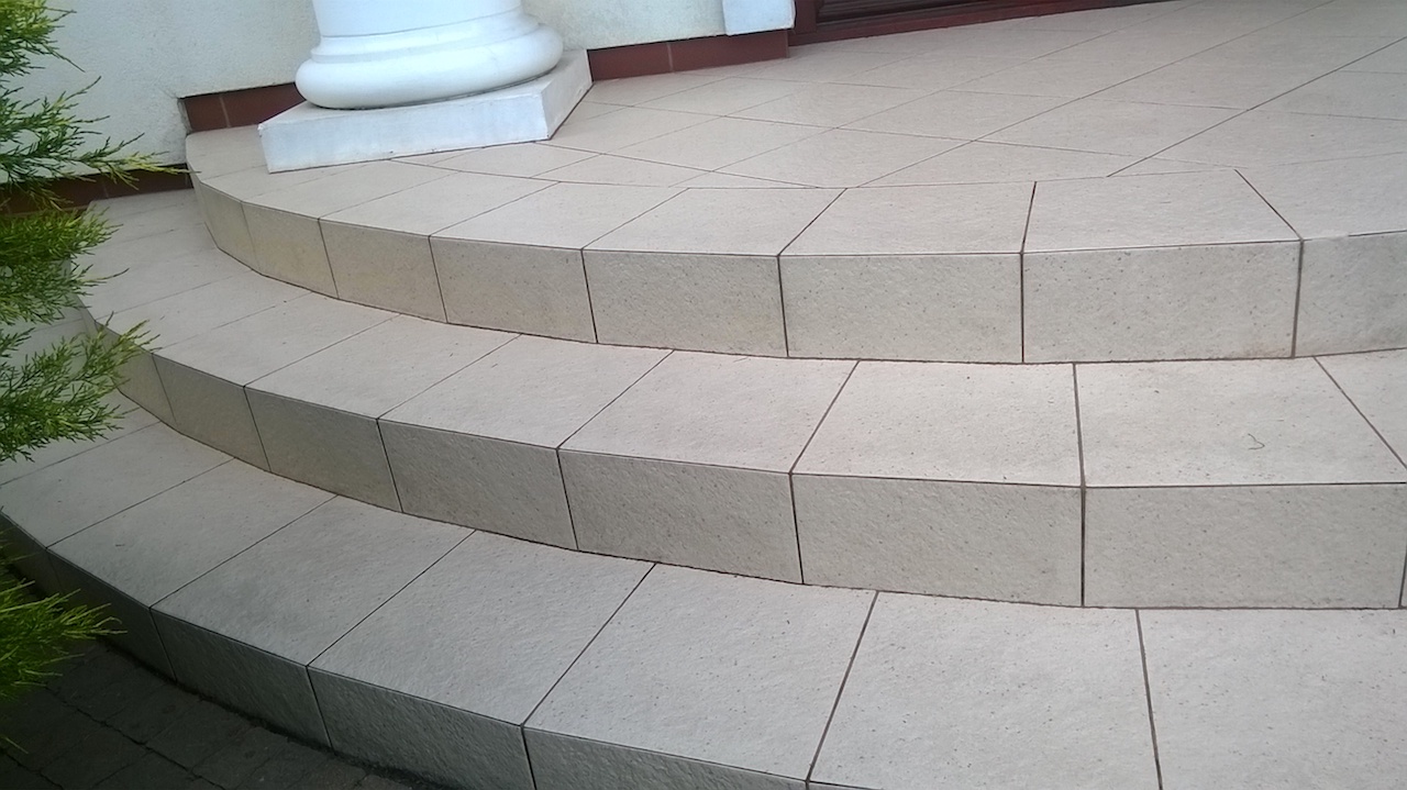 Półokrągłe schody ze szlifowanym rantem. Płytka gresowa.